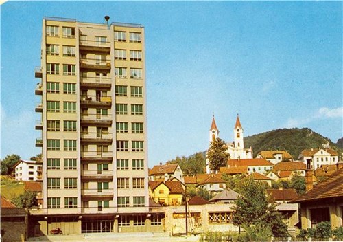 Na razglednici je stolpnica in cerkev sv Petra in Pavla z okolico