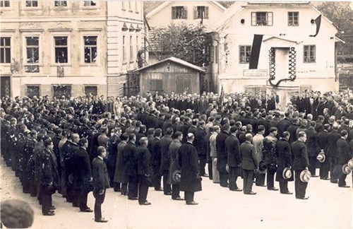 Na razglednici je otvoritev spomenika žrtvam I. svetovne vojne ...
