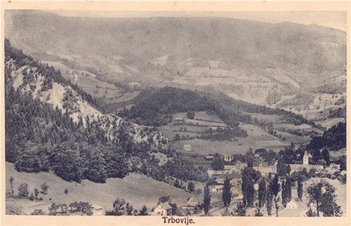Na razglednici je pogled na zgornji del Trbovelj s cerkvijo sv. Martina, spodaj je napis Trbovlje, posnetek je nastal leta 1916-1917