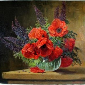 Mohn und Lupinien in Glasvase