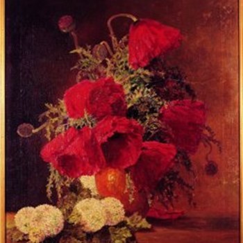Roter Mohn und Schneeball in braun-gelber Vase