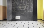 Academically–trained painter and children’s book illustrator Janez Vidic created interior wall paintings for several clients in the Štajerska region. In 1985 he created a scratch piece in the interior of today’s regional Radio and Television Centre (RTV) near Pekrska gorca, where at the time Radio Maribor started to broadcast. The design gives the appearance of a divided space – an illuminated interior and the dark outside world. A girl is gazing through a window and observing events from a safe and sunlit shelter. Unfolding in front of her is a curious night scene with a bat, carnival figure (kurent), rooster and several other objects. The wall painting is characterised by intricate drawing, which is most noticeable in the various patterns used to fill previously empty surfaces. The scratch piece gives the impression of a puzzle or a mosaic, and is in parts reminiscent of painted beehive panels. In his work Vidic regularly included motifs that were rooted in Slovenian folklore. Most frequent are depictions of roosters, bouquets of flowers and vernacular clocks. With the selected motifs the artist adapted the composition’s content to the users of the space who are engaged in the field of culture. (Nike Duh, in the framework of the Creative Path to Knowledge project, Virtual guide; The investment is co–financed by the Republic of Slovenia and the European Union from the European Social Fund