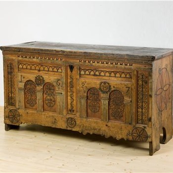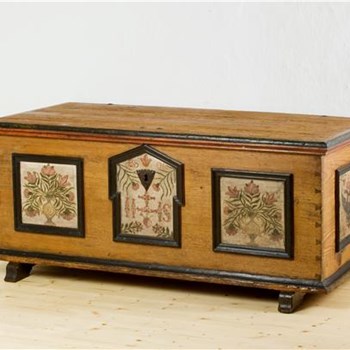 -: poslikana skrinja (ženitovanjska skrinja)