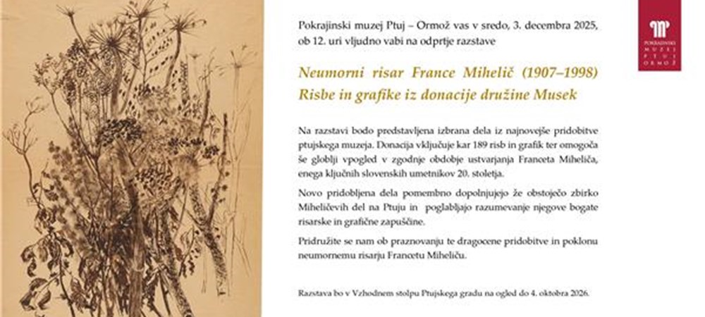 Na razstavi bodo predstavljena izbrana dela iz najnovejše pridobitve ptujskega muzeja. Donacija vključuje kar 189 risb in grafik ter omogoča še globlji vpogled v zgodnje obdobje ustvarjanja Franceta Miheliča, enega ključnih slovenskih umetnikov 20. stoletja. Novo pridobljena dela pomembno dopolnjujejo že obstoječo zbirko Miheličevih del na Ptuju in poglabljajo razumevanje njegove bogate risarske in grafične zapuščine.