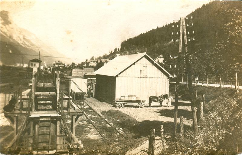 Črno-bela razglednica, pogled na železniško progo s starim železniškim konzumom in drezino.