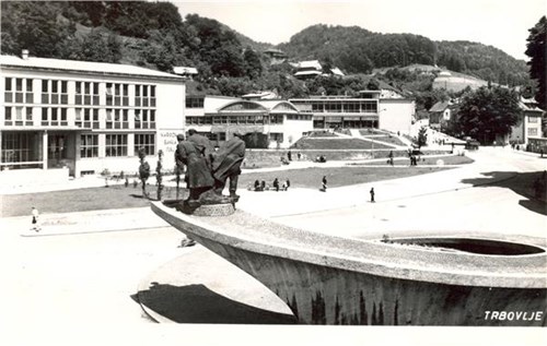 Na razglednici je pogled na Spomenik Revolucije v Trbovljah, v ozadju je veleblagovnica.