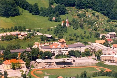 Na razglednici je pogled na stadion Rudarja, bolnico, vrtec Pikapolonica in loško cerkev.