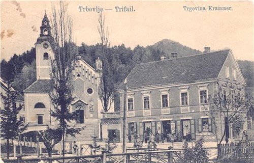 Na razglednici je pogled na cerkev sv. Martina in na trgovino Krammer.