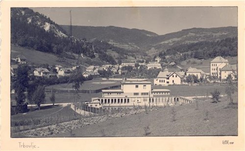 Na razglednici je pogled na bazen v Trbovljah pred drugo svetovno vojno.
