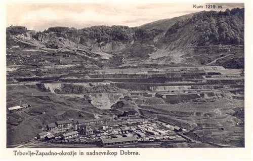 Na razglednici je pogled na zapadno okrožje in dnevni kop Dobrna s Kumom v ozadju. Levo se vidi cerkev v Retju.