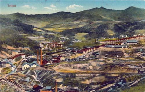 Na razglednici je pogled na glažuto, konzum ter rudniške kolonije v Trbovljah. V ozadju se vidijo okoliški hribi. Razglednica je barvna.