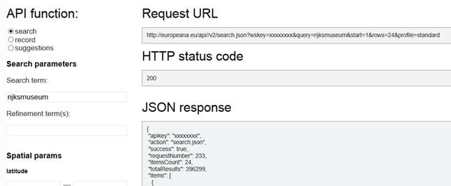 Once we had the initial connections, it was time to actually start calling the API. The API returns results in JSON format, so decoding the results and understanding the data structure was a necessary first step. We used Europeana Labs’ Console tool, which enables users to enter a search term and then generates a request and response for that particular search term. It’s a useful tool and it makes development easier, especially at the beginning.
