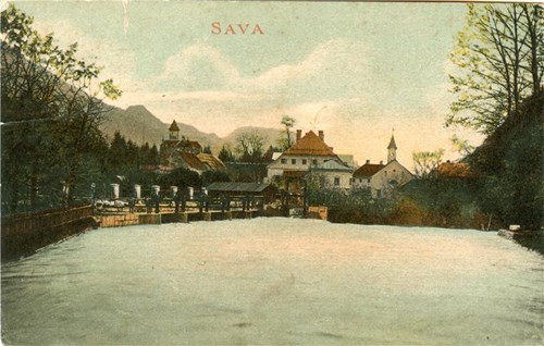 Kolorirana razglednica, Stara sava, v ospredju reka Sava; Znamke ni več, žig slabo čitljiv: Jesenice-Assling.