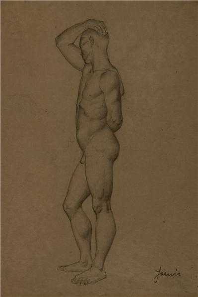 telo v profilu obrnjeno v l.,glava obrnjena vstran, d. roka dvignjena, dlan na glavi;