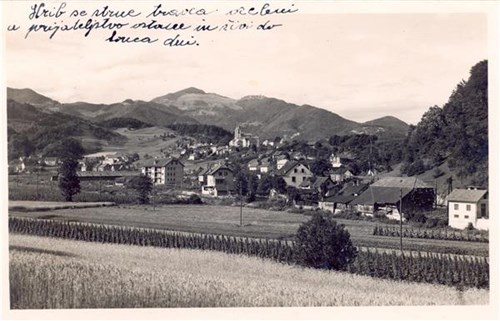 Na razglednici je pogled proti cerkvi sv Petra in Pavla z okolico,