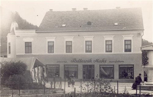 Na razglednici je pogled na zgornji del Trbovelj s trgovino Podlesnik, okolica cerkve sv. Martina