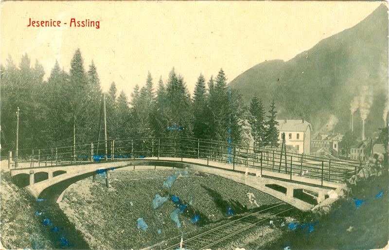 Črno-bela razglednica, most čet železniško progo v Hrenovico, v ozadju tovarna. Znamka: 5 Hellerjev, cesar; žig (nečitljivo).