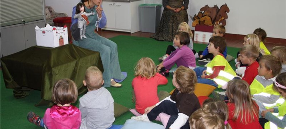 Predšolski otroci prisluhnejo zgodbi o Malem kurentu. Pod vodstvom muzejskega...