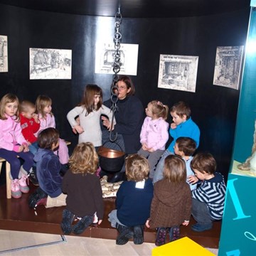 Predšolski otroci prisluhnejo zgodbi o Malem kurentu. Pod vodstvom muzejskega...
