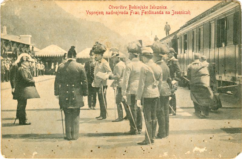 Črno-bela razglednica, otvoritev Bohinjske železnice, sprejem Franca Ferdinanda.