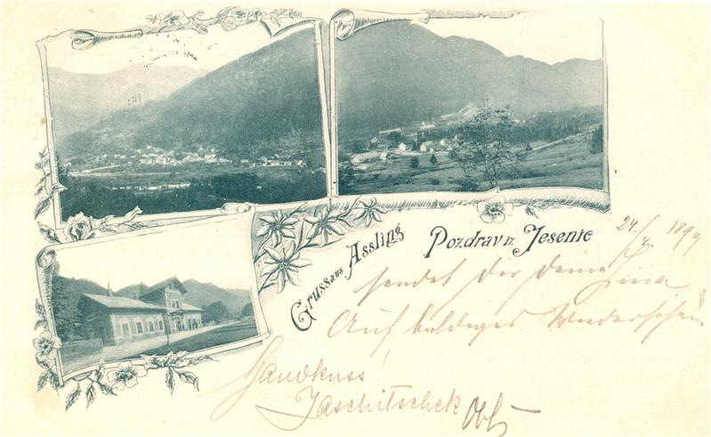Črno-bela razglednica, izseki panoramskih fotografij Jesenic in železniške postaje. Znamka: Oesterr. post., 2 Hellerja; Žig: Laibach-Ljubljana
