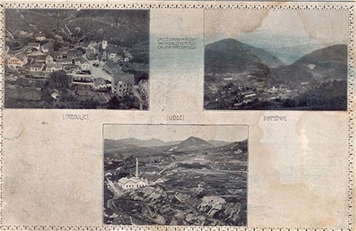 Na razglednici so trije motivi: zgornji del Trbovelj ob cerkvi sv. Martina, Vode in Hrastnik.