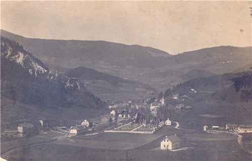Na razglednici je pogled na staro pokopališče v zgornjih Trbovljah.