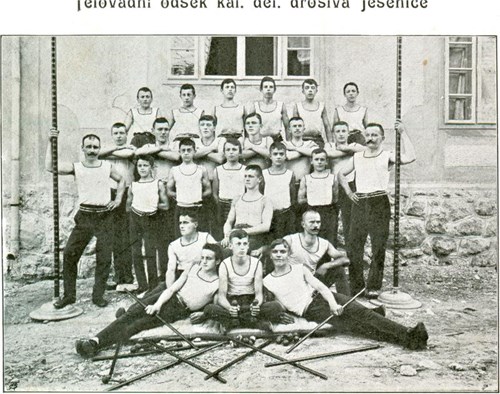 Črno-bela razglednica, fotografija članov telovadnega odseka kat. del. društva
